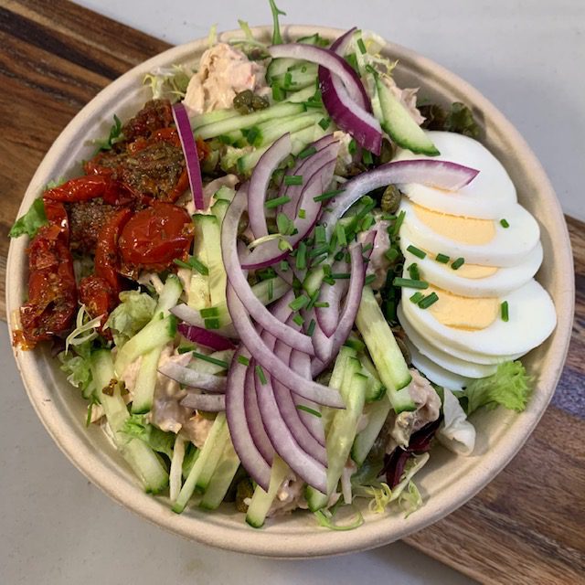 Ingrediënten: Jonge kaas, tomaat, komkommer, ei, peper, zout, gemengde sla