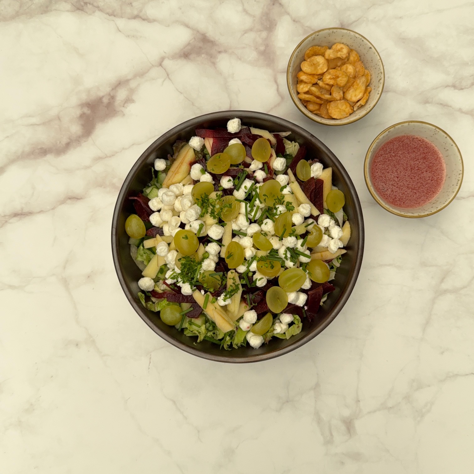 Ingrediënten: Geitenkaas, rode biet, appel, komkommer, witte druiven, verse bieslook, framboos dressing, honing, broad beans, gemengde sla