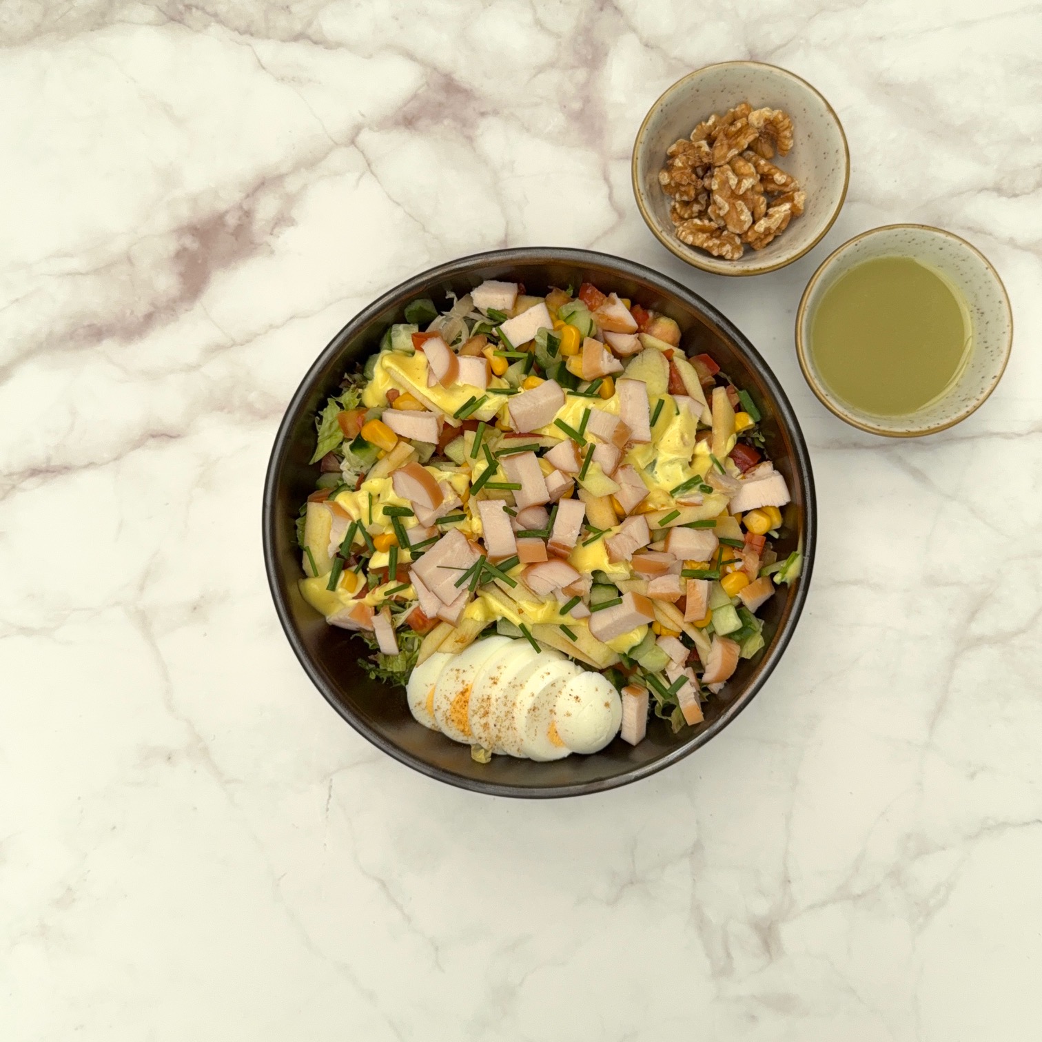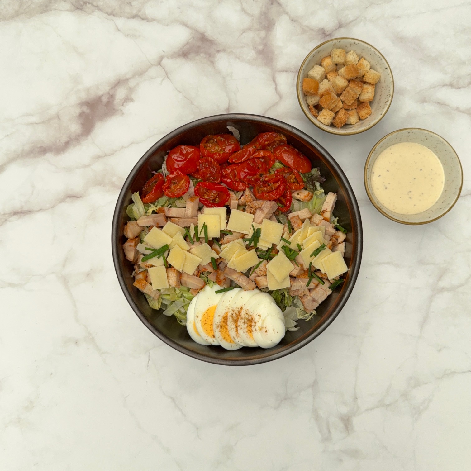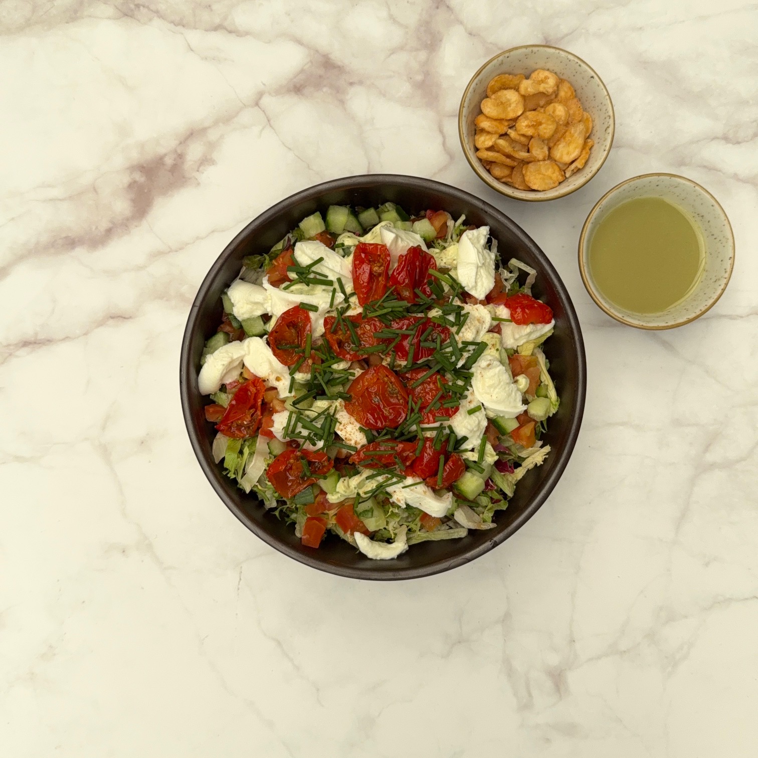 Ingrediënten: Mozzarella, zongedroogde tomaat, olijven, tomaat, komkommer, peper, zout, verse bieslook, broad beans, pestosaus, gemengde sla, mosterddressing