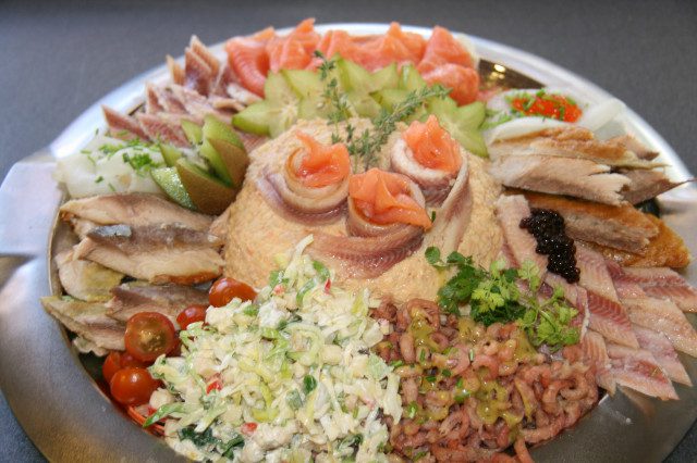 Zalmsalade gegarneerd met Hollandse haring, garnalen, gerookte makreel en Noorse zalm. Gegarneerd met zilveruitjes en augurk.