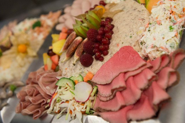 Zalmsalade gegarneerd met zilveruitjes, augurk, Hollandse haring, garnalen, gerookte makreel en Noorse zalm.